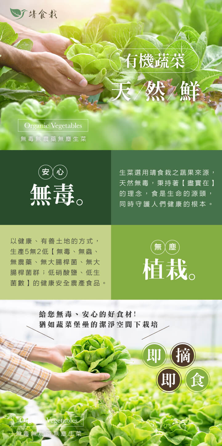 生菜選用【靖食栽】蔬菜來源,給您無毒、安心的盡實在好食材!在猶如蔬菜堡壘的潔淨空間下栽培,提供給您一塵不染、即摘即食的無毒、健康、安心的好食材。